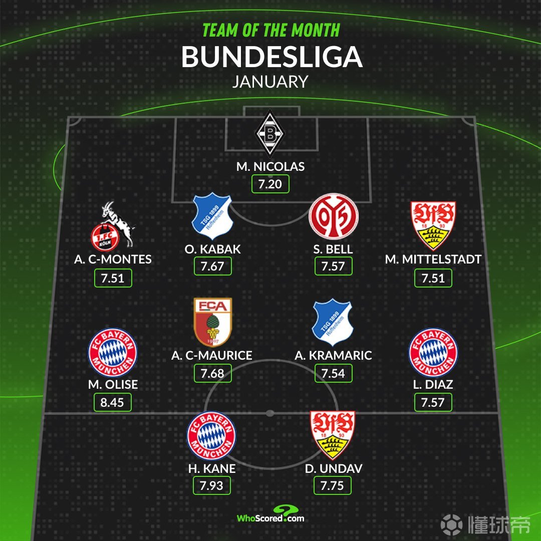 德甲月最佳陣容:凱恩、奧利塞、迪亞斯入選