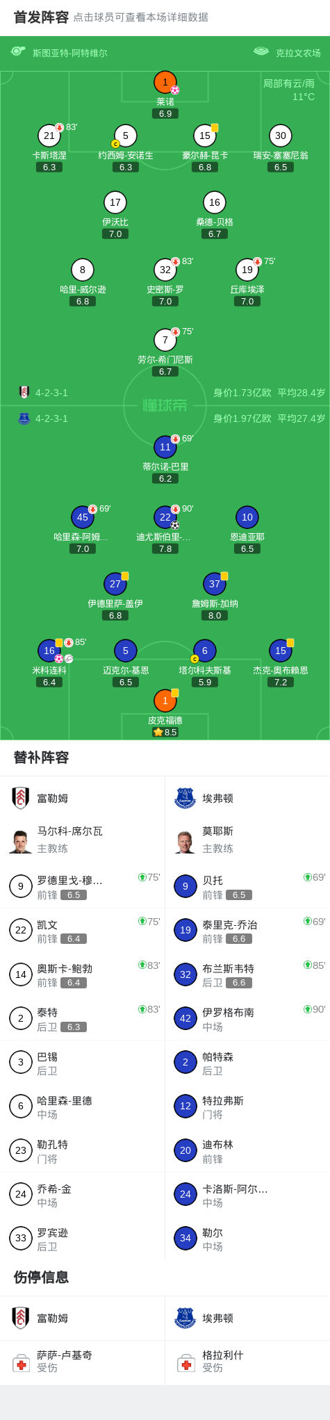 北京時(shí)間2月7日英格蘭足球頂級(jí)聯(lián)賽 聯(lián)賽 第25輪,富勒姆主場(chǎng)對(duì)陣埃弗頓。富勒姆萊諾自擺烏龍。上半場(chǎng)埃弗頓迪尤斯伯里-霍爾破門,下半場(chǎng)米科連科自擺烏龍,門將萊諾自擺烏龍。最終比分富勒姆 1-2 埃弗頓。