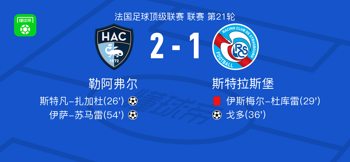 北京時(shí)間2月9日法國(guó)足球頂級(jí)聯(lián)賽第21輪,勒阿弗爾主場(chǎng)迎戰(zhàn)斯特拉斯堡。比賽中,勒阿弗爾球員通過(guò)配合由斯特凡-扎加杜率先破門(mén);隨后斯特拉斯堡一名球員吃到紅牌,人數(shù)處于劣勢(shì);不久后斯特拉斯堡球員戈多扳平比分;下半場(chǎng)勒阿弗爾再通過(guò)配合由伊薩-蘇馬雷打入制勝球。最終勒阿弗爾2-1戰(zhàn)勝斯特拉斯堡。